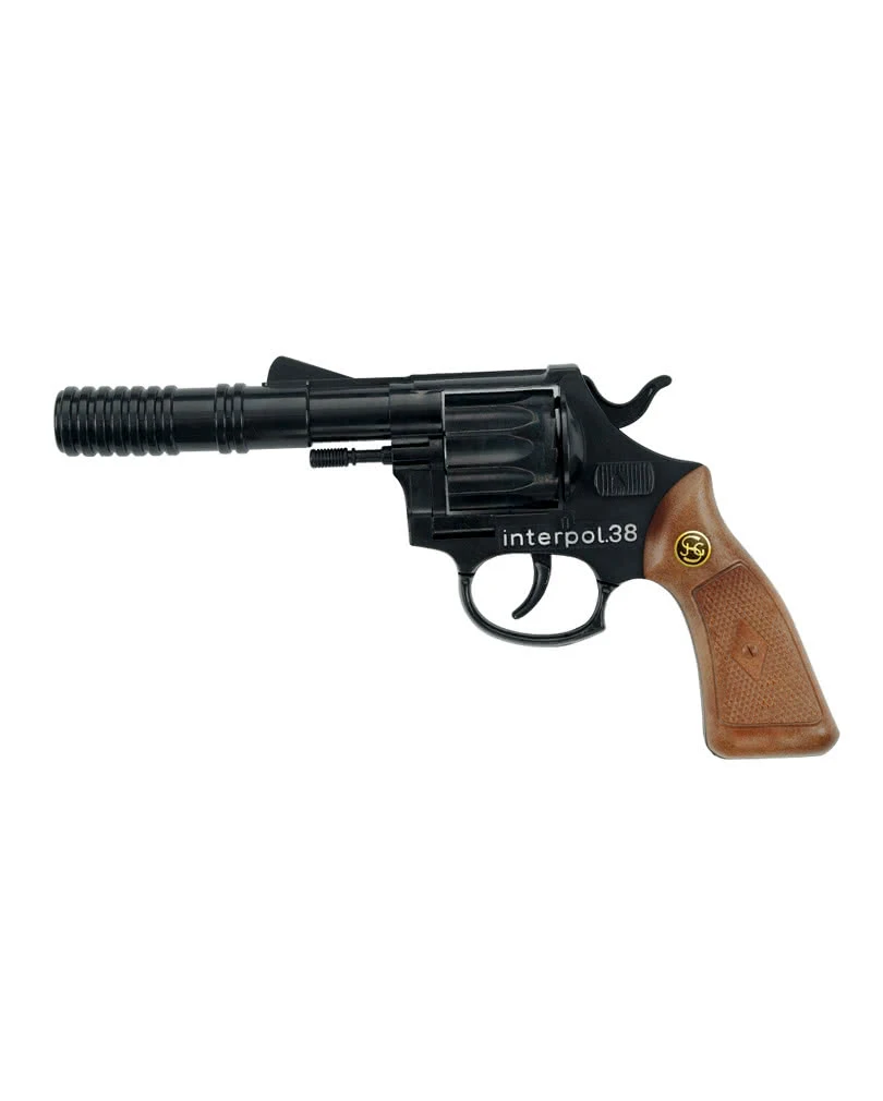 Authentisch gearbeiteter Interpol 38 12-Schuss Revolver mit abschraubbarem Schalldämpfer für kleine Sheriffs, Cowboys und Polizisten. Die Spielzeugpistole ist aus Zink und Kunststoff gefertigt, was die Waffe sehr realistisch wirken lässt. Der Lauf ist aus Metall, während der Griff aus braunem Kunsstoff, durch seine geriffelte Oberfläche für guten Halt sorgt. Die passende 12-Schuss-Munition ist nicht im Lieferumfang enthalten! Bestelle dir deshalb am besten gleich unsere 12 Munitionsringe a 12 Schuss mit!