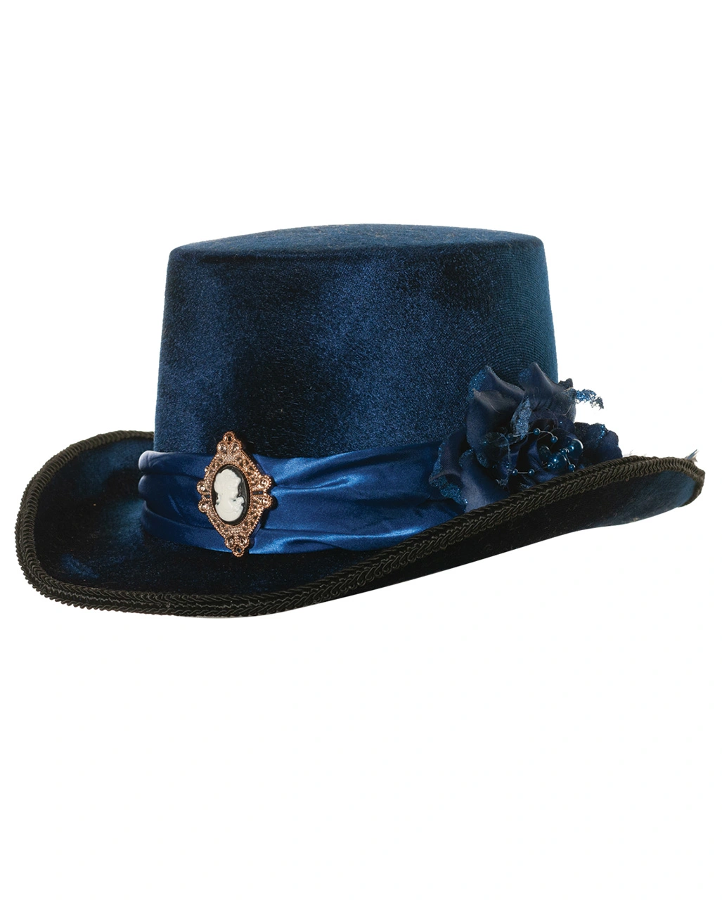 Unser Viktorianischer Damen Zylinder mit Cameo kommt in schlichtem Dunkelblau. Als viktorianische Kopfbedeckung für Damen überzeugt das Design mit einem glitzernden Rosenschmuck sowie einem verspielten Hutband und einer Brosche. Der blaue Damenhut für Halloween ist liebevoll gearbeitet und lässt sich zu diversen Verkleidungen tragen. Er ist in Größe 57 verfügbar und passt ideal zu unserem Viktorianischer Gothic Mantel
